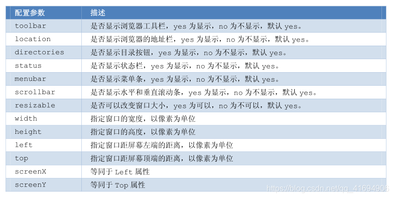 配置参数:用来描述新窗口的外观等信息,可以使用以下的一个或几个,用分号“;”隔开。
