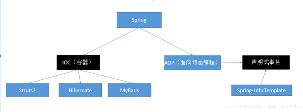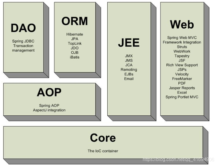 Core Container:核心容器(IOC);黑色代表这部分的功能由哪些jar包组成;要使用这个部分的完整功能,这些jar都需要导入