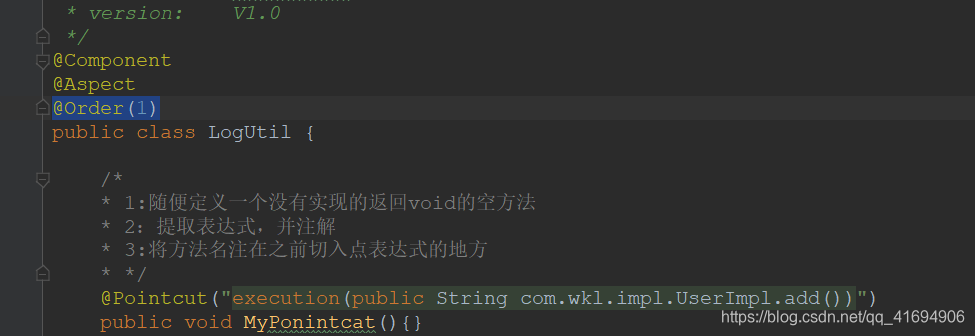 @Pointcut("execution(public String com.wkl.impl.UserImpl.add())")