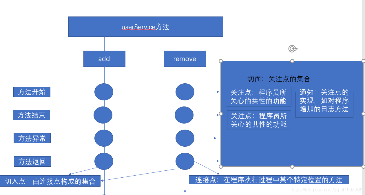 - 横切关注点:从每个方法中抽取出来的同一类非核心业务。如方法执行前输出日志;