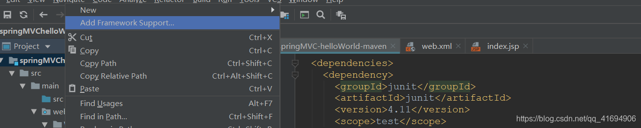 配置完pom.xml之后,我们在idea中要添加一下框架的支持。右击我们的项目文件夹,选择add framework support