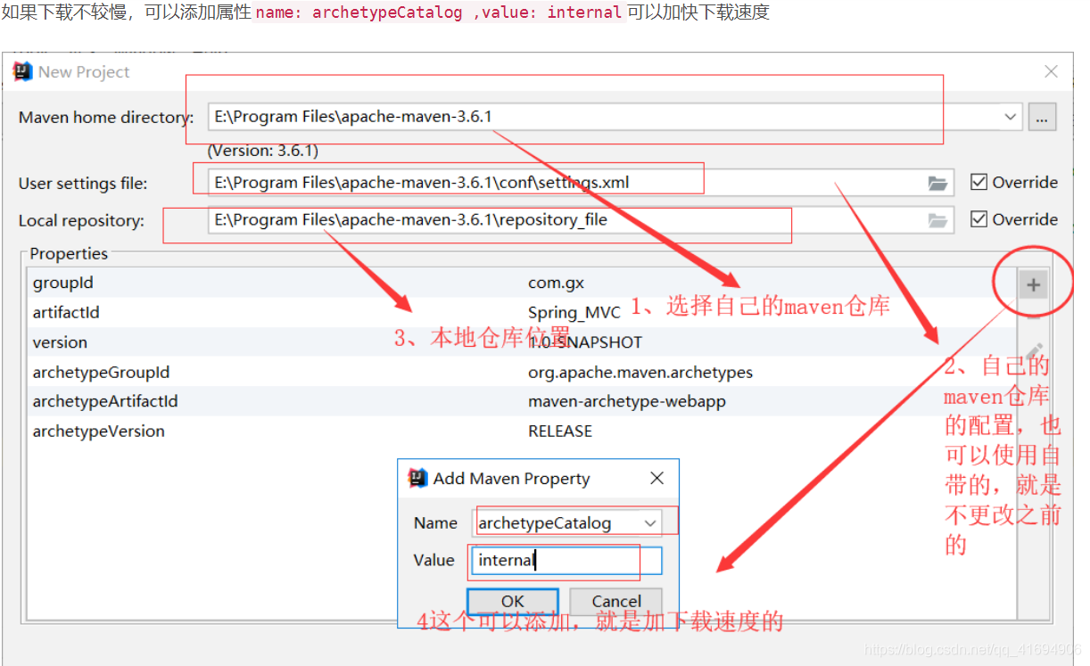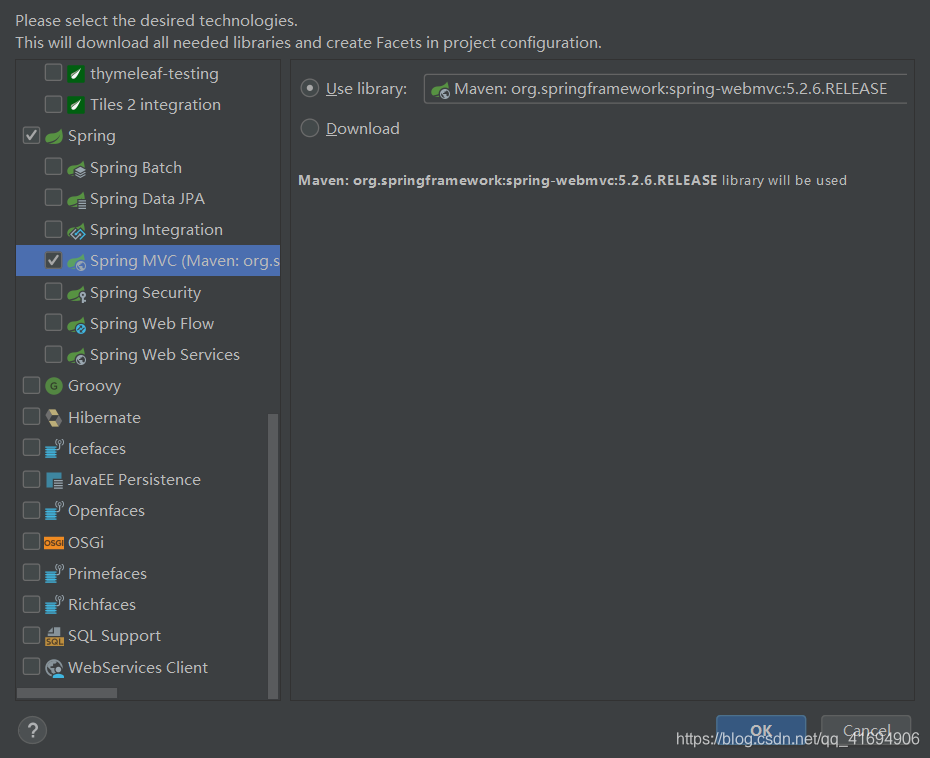 将下图中的Spring和Spring下的Spring MVC都勾上,之前配置pom.xml文件时,已经自动下载了spring相关文件,所以这里就直接用之前下载好的就可以了,OK。(注意:点了Add framework support之后,在下图中有可能会找不到Spring,解决办法在下图的下方