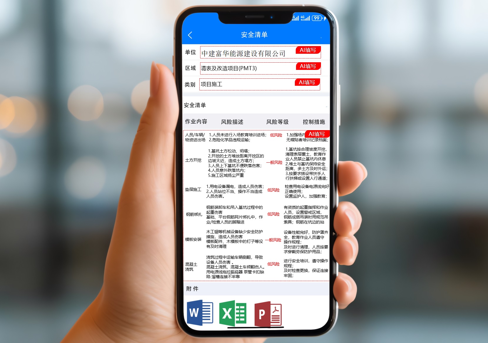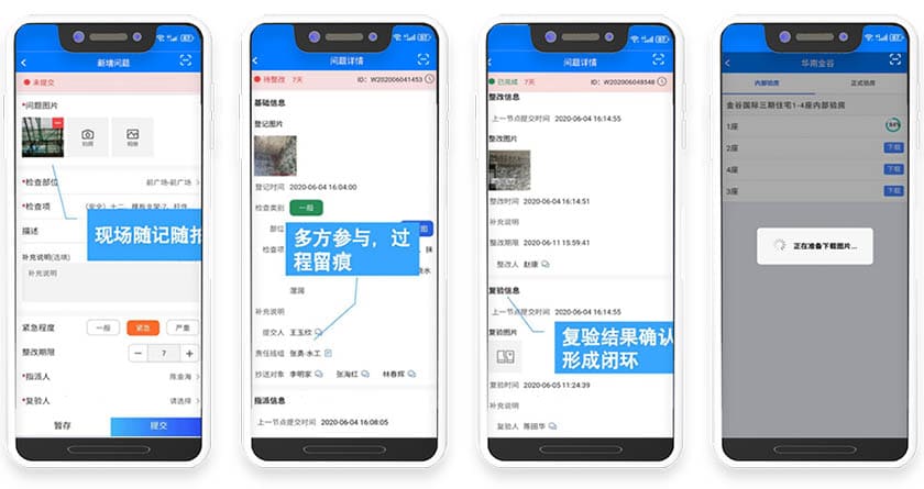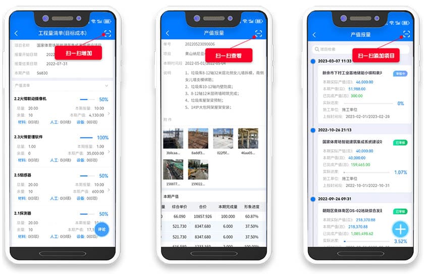 扫码上报当天施工现场图片和小视频;一码统计材料、设备的进场与出场情况,抓细节、控风险,每天工地上的进度、质量、成本、安全情况一手掌控。
