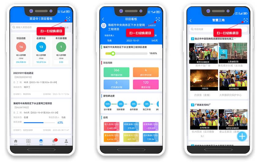 一键扫码,自动汇总、分析、筛选、抽取数据多项目,集成在项目数字指挥室内的数字化管理中心平台大屏上。涵盖了项目上所有的可视化数据、动态记录、警示提示以及成本、进度、质量与安全情况,实现一码统揽,一键数字画像。