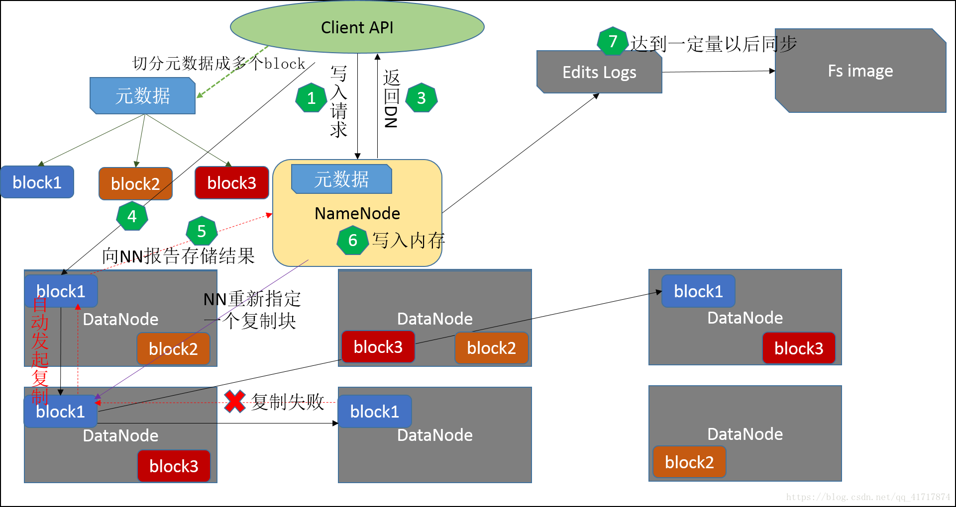 4.DataStreamer会去处理接受dataqueue,它先问询NameNode这个新的block最适合存储的在哪几个DataNode里,比如重复数是3,那么就找到3个最适合的DataNode,把它们排成一个pipeline。DataStreamer把packet按队列输出到管道的第一个 DataNode 中,第一个 DataNode又把 packet 输出到第二个 DataNode 中,以此类推。