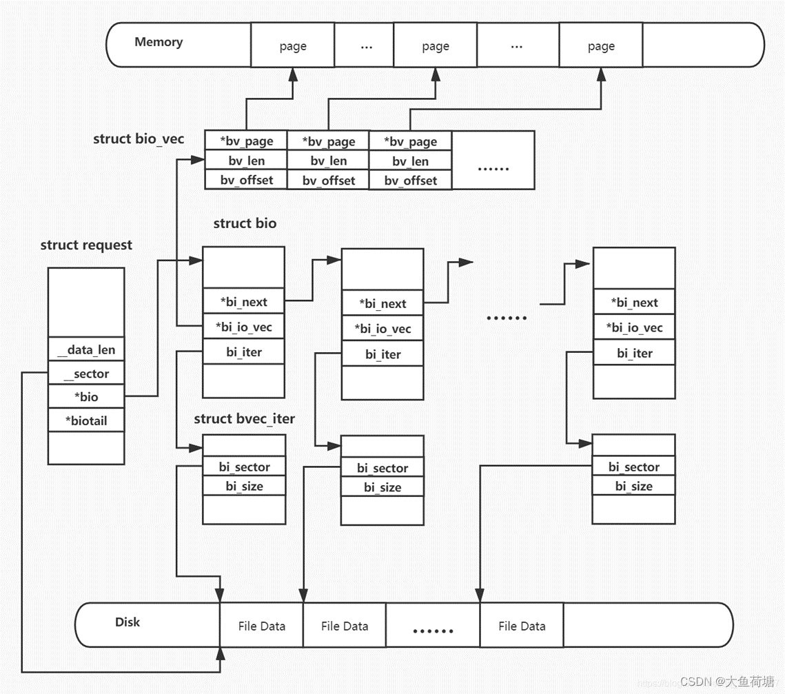 bio是block层的IO最小单元,负责在block层以及其上下层之间传递数据。 bio数据结构中除了包含IO的一些基础信息,操作类型(读/写/discard...),作用的磁盘/分区(反应在bi_disk指针上),IO优先级,状态等等。 bio最重要的信息是描述了磁盘上一段连续数据与内存页的映射关系,主要由bi_vcnt,bi_io_vec,bi_iter 描述。