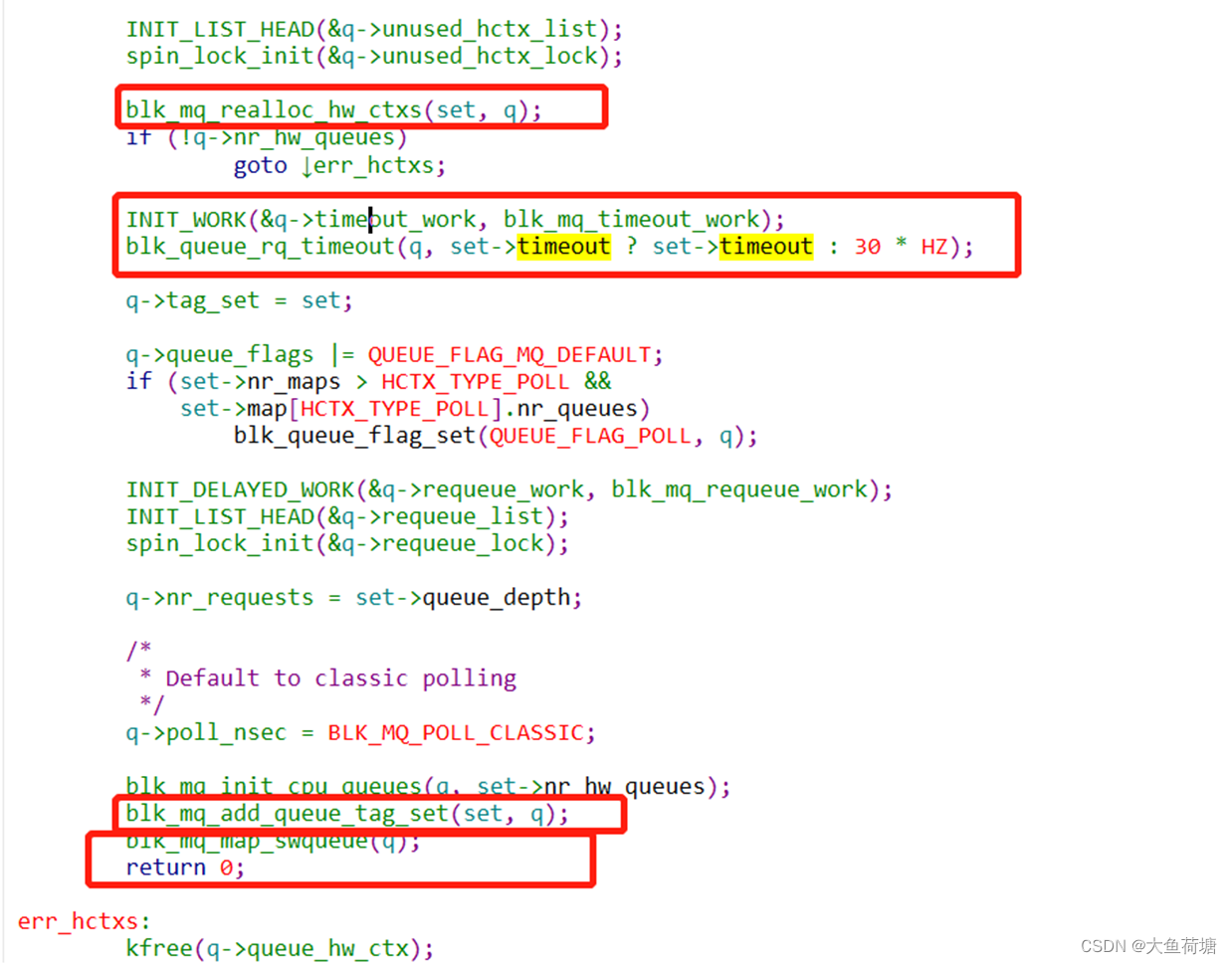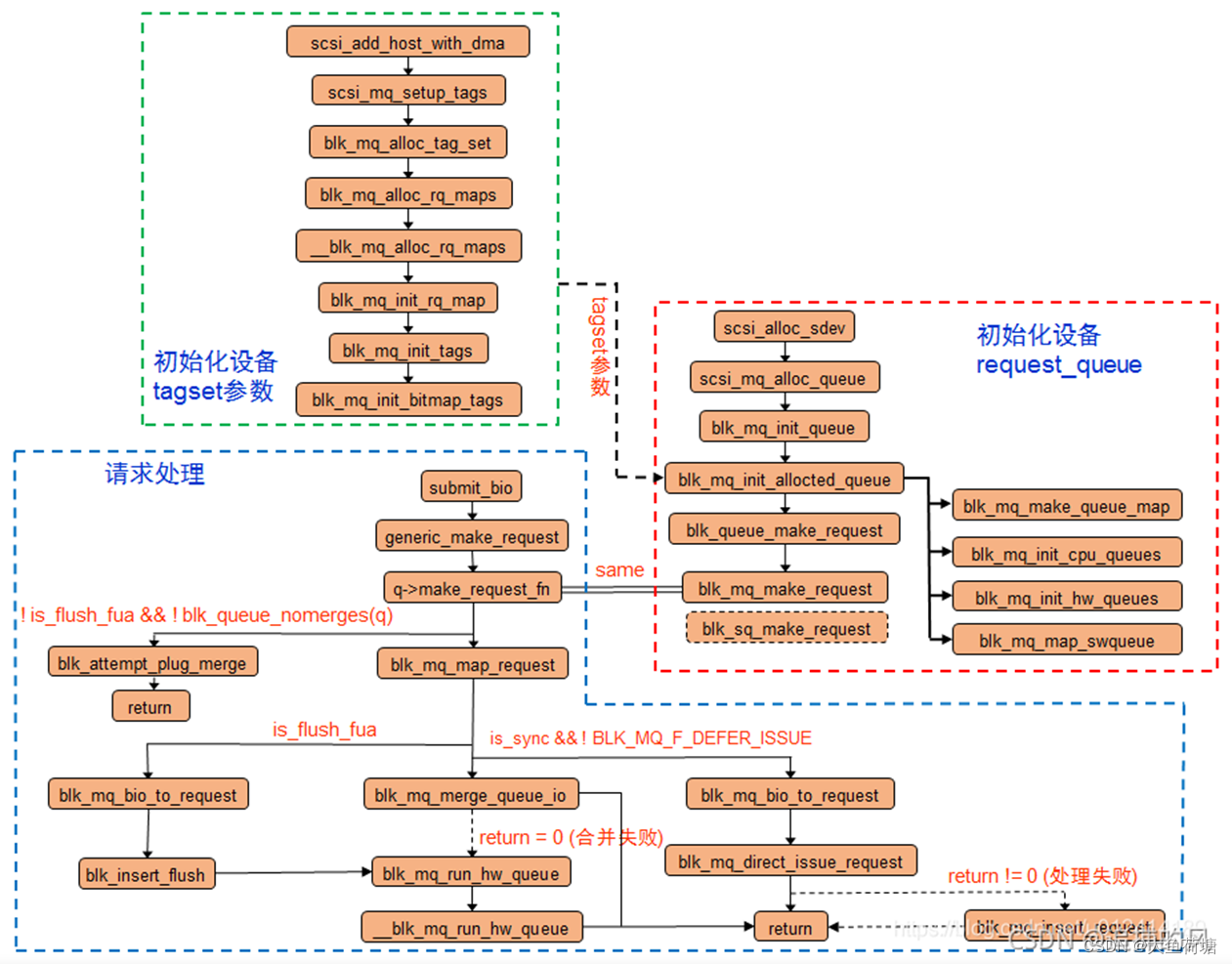blk_mq_init_queue实现对每一个scsi设备分配request_queue,软硬件队列之间,硬件队列和tags之间的相互链接,设置该scsi设备的请求超时时间。