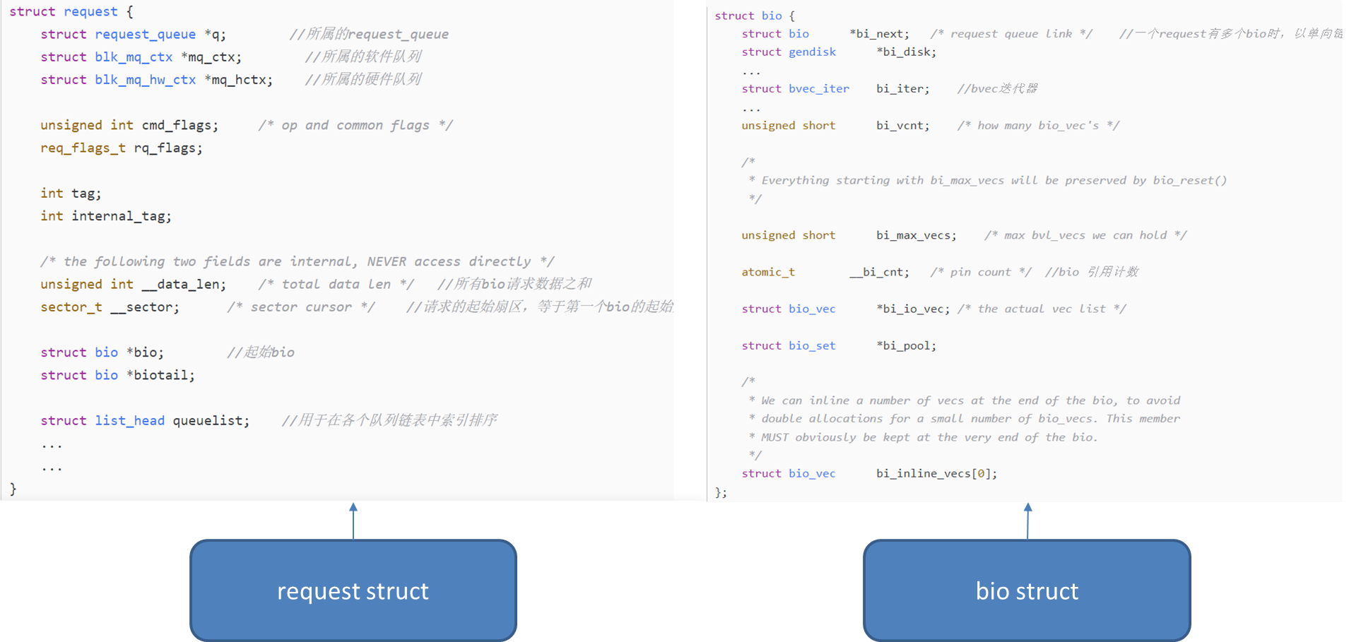 request是block层下发给scsi层的最小的IO单元(IO调度的最小单元),描述一段block设备地址连续的IO请求,包含一个或者多个连续的bio,还包含了调度器及软硬件队列(mq_ctx和mq_hctx)管理request时需要使用的链表节点结构。其中request结构体中__sector记录当前request请求的IO在磁盘上的起始扇区以及数据长度;__data_len记录当前request需要对block设备进行操作的数据大小;bio指向request第一个bio;bio_tail指最后一个bio。