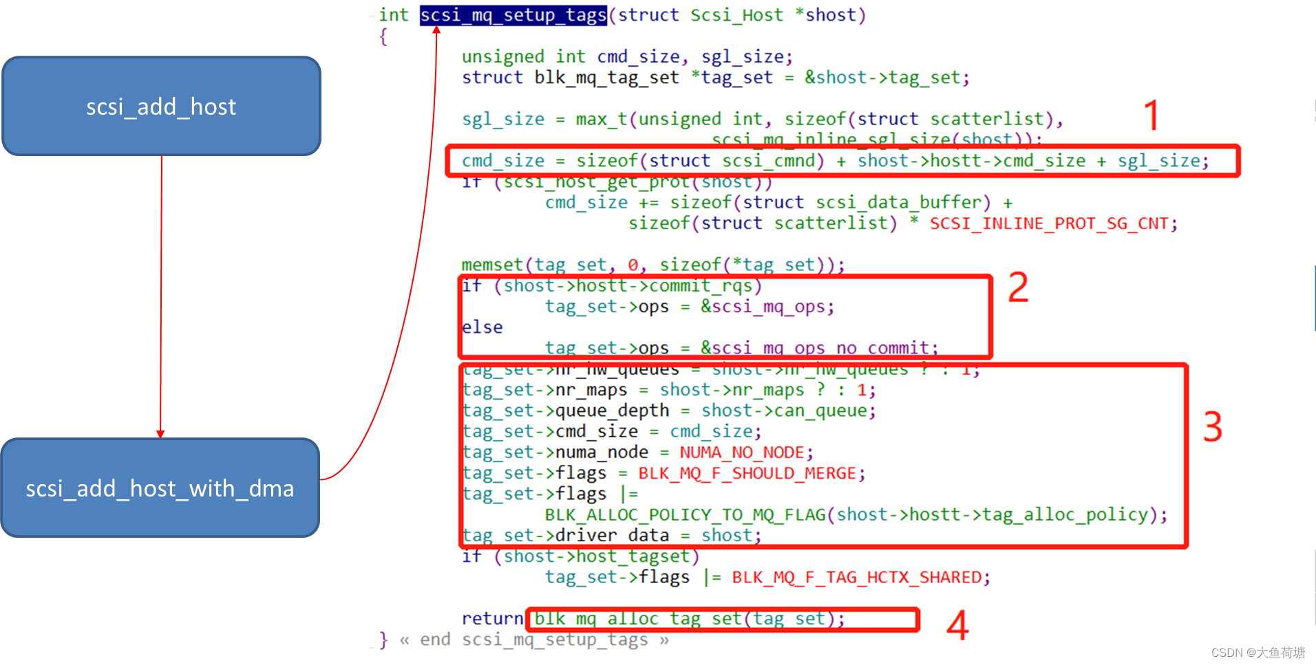 需要值得注意的是cmd_size不仅有从底层驱动程序上报来的cmd_size,还包含了scsi_cmnd和sgl的大小;同时将scsi层与block层交互的函数挂载到tag_set->ops上。scsi_mq_setup_tag执行完毕后blk_mq_tags和对应的request池会链接起来,为后续硬件队列的链入打下基础。