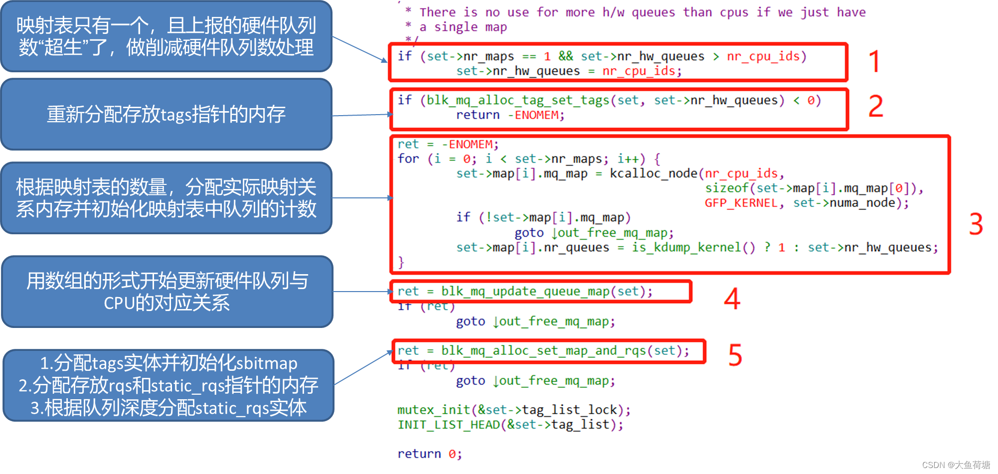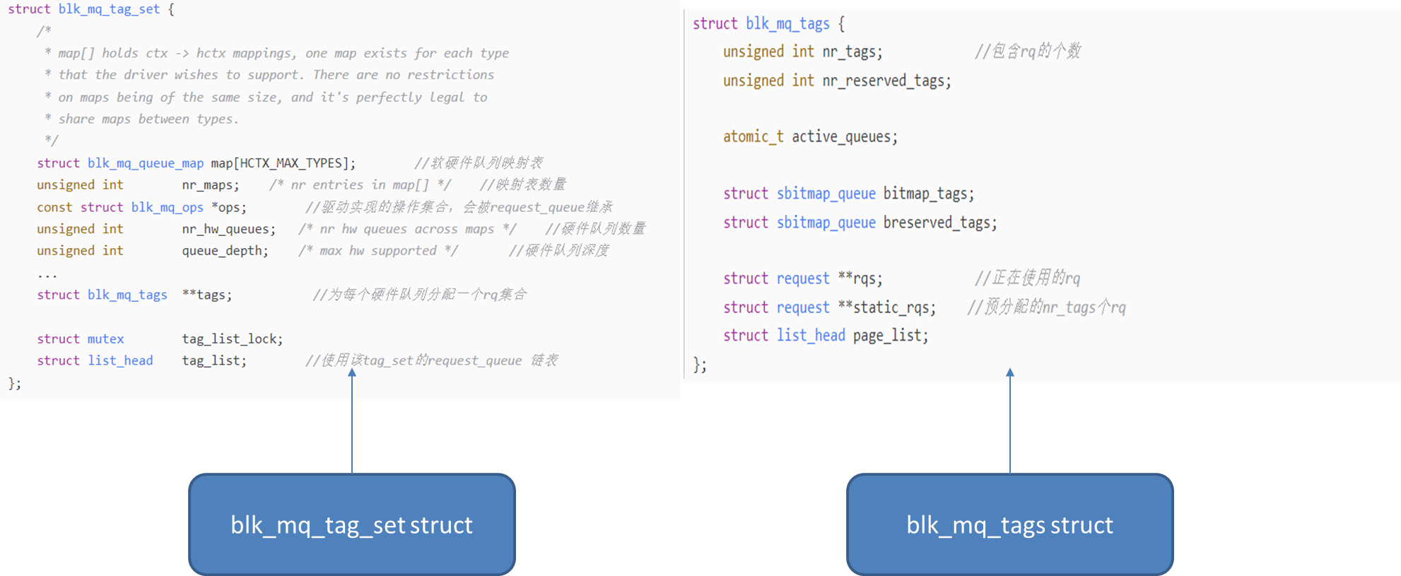 blk_mq_tag_set和blk_mq_tags很容易被混淆。实际上blk_mq_tag_set作为一种公共属性的结构,scsi层通过上报来的参数填充blk_mq_tag_set(比如硬件队列数;映射表数量;队列深度;命令区大小-非CDB,远比CDB复杂;标志),起到更新软硬件队列映射关系,根据硬件队列数分配blk_mq_tags,根据队列深度预分配request池并初始化的作用。