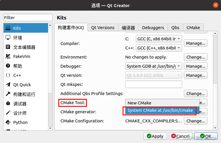 找到 CMake 工具, 选择系统 安装的CMake 工具,如果没有,可自行百度安装。或者选择自已需要的cmake 版本。
