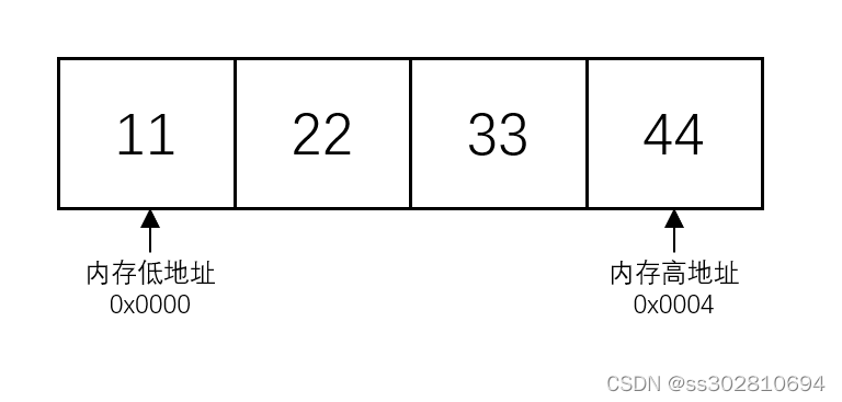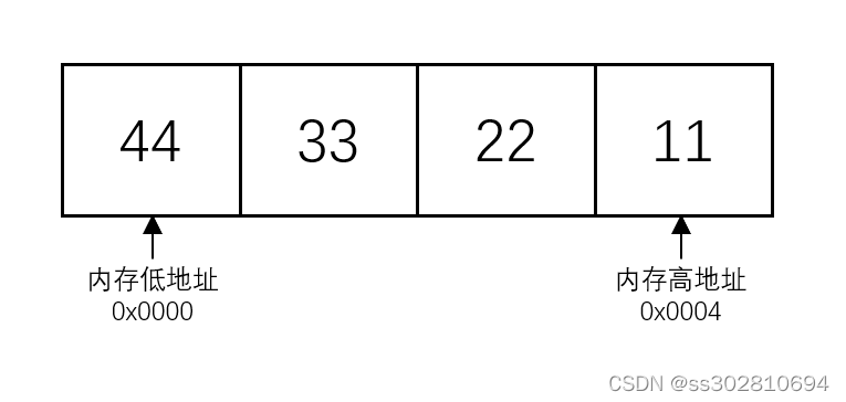 小端序(Little endian):将低序字节存储在起始地址,与大端相反,内存低地址存数据低位,内存高地址存数据高位,在调试时查看内存值的时候往往需要手动转字节序。例如0x11223344在内存中的存储方式为: