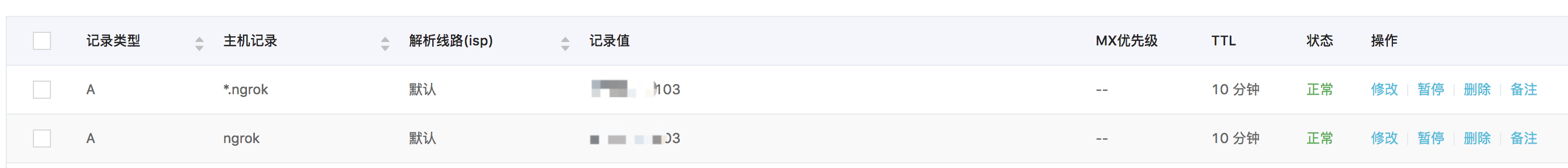 增加2条A记录,指向你的服务器。这里我配置的是 ngrok.xxxx.com 和 *.ngrok.xxxx.com