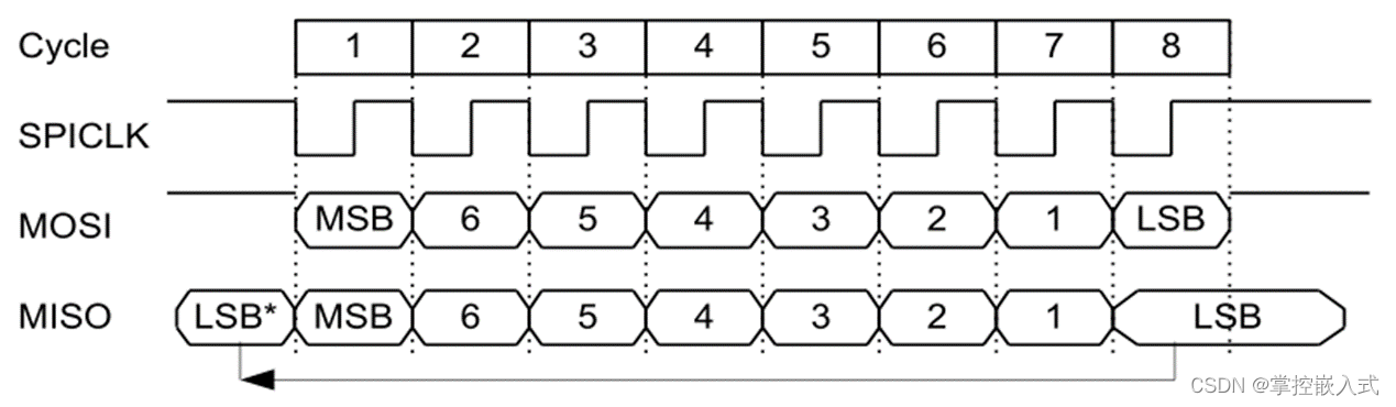 SPI总线采用同步方式工作,时钟线在上升沿或下降沿时发送器向数据线上发送数据,在紧接着的下降沿或上升沿时接收器从数据线上读取数据,完成一位数据传送,八个时钟周期即可完成一个字节数据的传送;