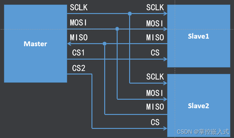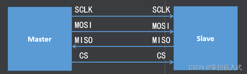 SPI(Serial Peripheral Interface)是串行外设接口的缩写,SPI是一种高速的、全双工、同步的串行通信总线;SPI采用主从方式工作,一般有一个主设备和一个或多个从设备; SPI需要至少4根线,分别是MISO(主设备输入从设备输出)、MOSI(主设备输出从设备输入)、SCLK(时钟,提供收发双方的时间基准)、CS(片选 chip select),SPI使用引脚较少且布线方便,所以越来越多的芯片集成了这种通信协议;