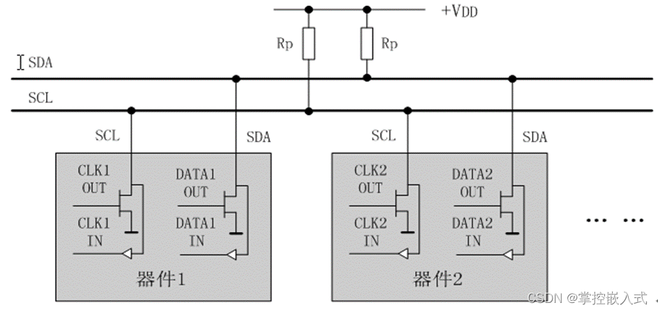 - 使用两条线(时钟线和数据线)进行全双工通信。I2C串行总线一般有两根信号线(数据线SDA、时钟线SCL),一根是双向的数据线SDA,另一根是时钟线SCL。所有接到I2C总线设备上的串行数据SDA都接到总线的SDA上,各设备的时钟线SCL接到总线的SCL上。(设备上的串行数据线SDA接口电路应该是双向的,输出电路用于向总线上发送数据,输入电路用于接收总线上的数据。而串行时钟线也应是双向的,作为控制总线数据传送的主机,一方面要通过SCL输出电路发送时钟信号,另一方面还要检测总线上的SCL电平,以决定什么时候发送下一个时钟脉冲电平)