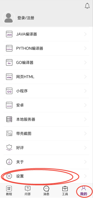 回到手机编程App------点击我的------滑动到最下面----点击设置: