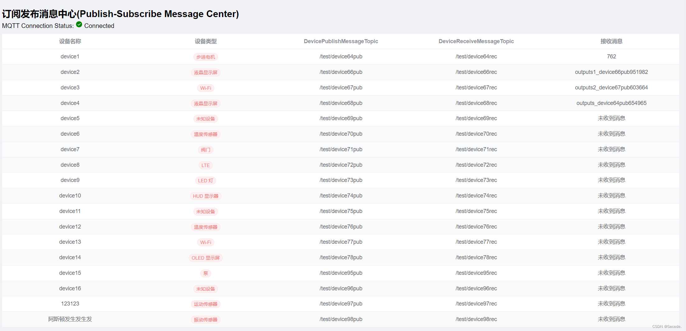 VUE3+SpringBoot+EMQX实现数据打通 client.on("message", (topic, payload) 主要是用于设置监听订阅消息的回调,不仅返回消息体本身,还会返回对应接收的消息主题(用于区分,发过来的消息是订阅的那个主题发过来的),在这里我们就可以用主题进行比对,从而过对消息更好的处理。MQTTFetchSubAllInfo 主要是从数据库获取现在所有设备的信息,包括其对应的订阅主题信息,然后对订阅主题信息进行循环遍历,一个一个去调用doSubscribe函数重新向EMQX平台订阅主题。设备的基础信息与主题信息都存入数据库。