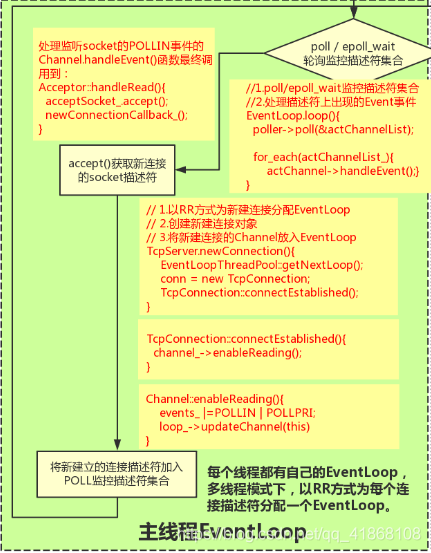 此外,图中的acceptor负责accept新连接,并将新连接分发到subReactor。这个组件在muduo中也叫做Acceptor。