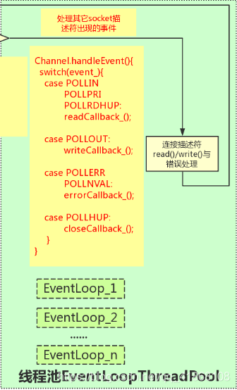 负责事件循环的部分在muduo命名为EventLoop,其他库如netty、libevent也都有对应的组件。