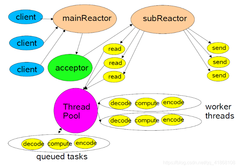 主从reactor是netty的默认模型,一个reactor对应一个EventLoop。主Reactor只有一个,只负责监听新的连接,accept后将这个连接分配到子Reactor上。子Reactor可以有多个。这样可以分摊一个Eventloop的压力,性能方面可能会更好。如下图所示: