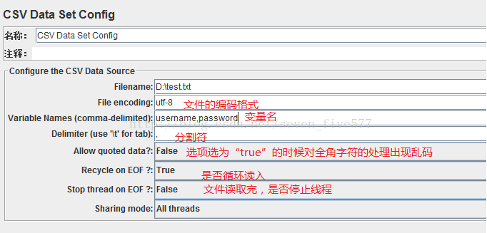 Recycle on EOF:是否循环读入,因为CSV Data Set Config一次读入一行,分割后存入若干变量中交给一个线程,如果线程数超过