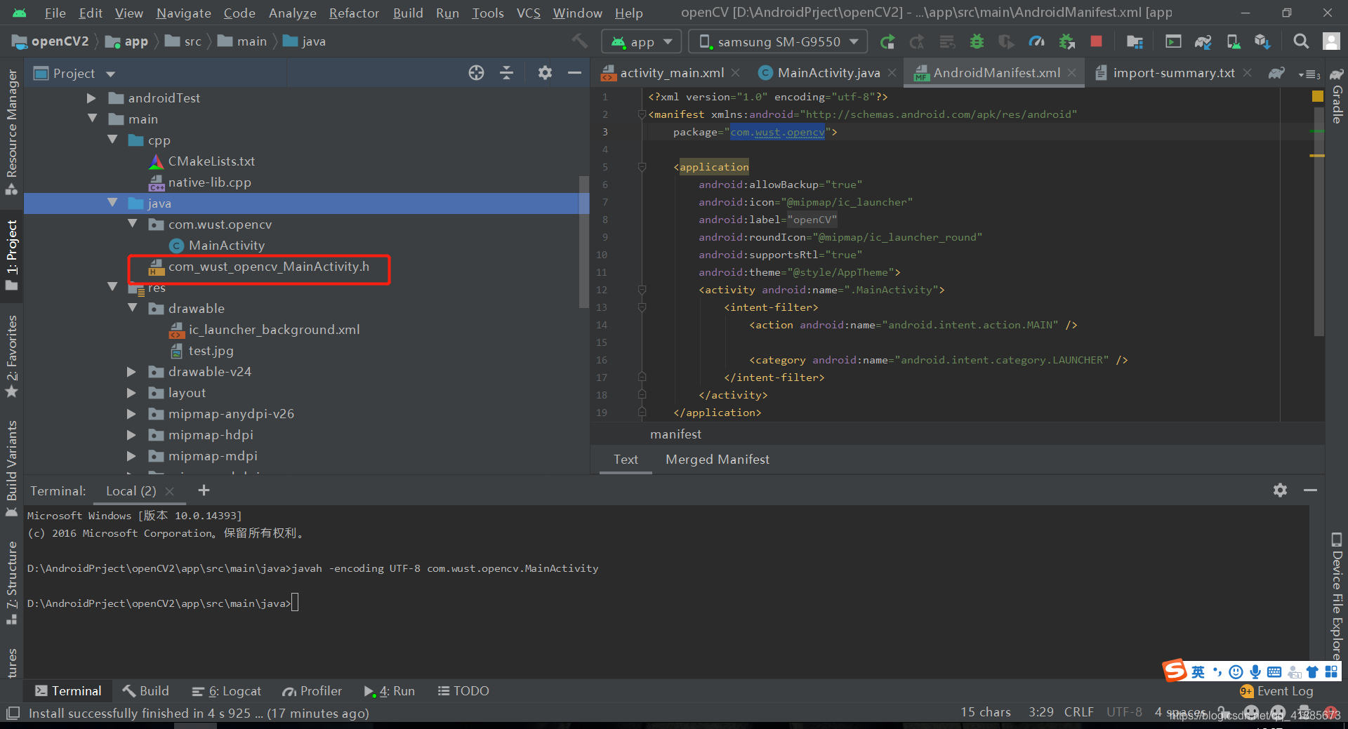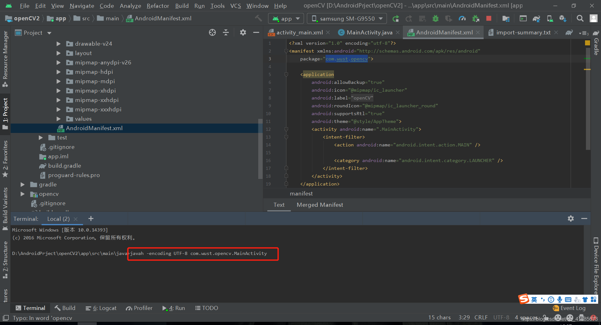 javah -encoding UTF-8 com.wust.opencv.MainActivity