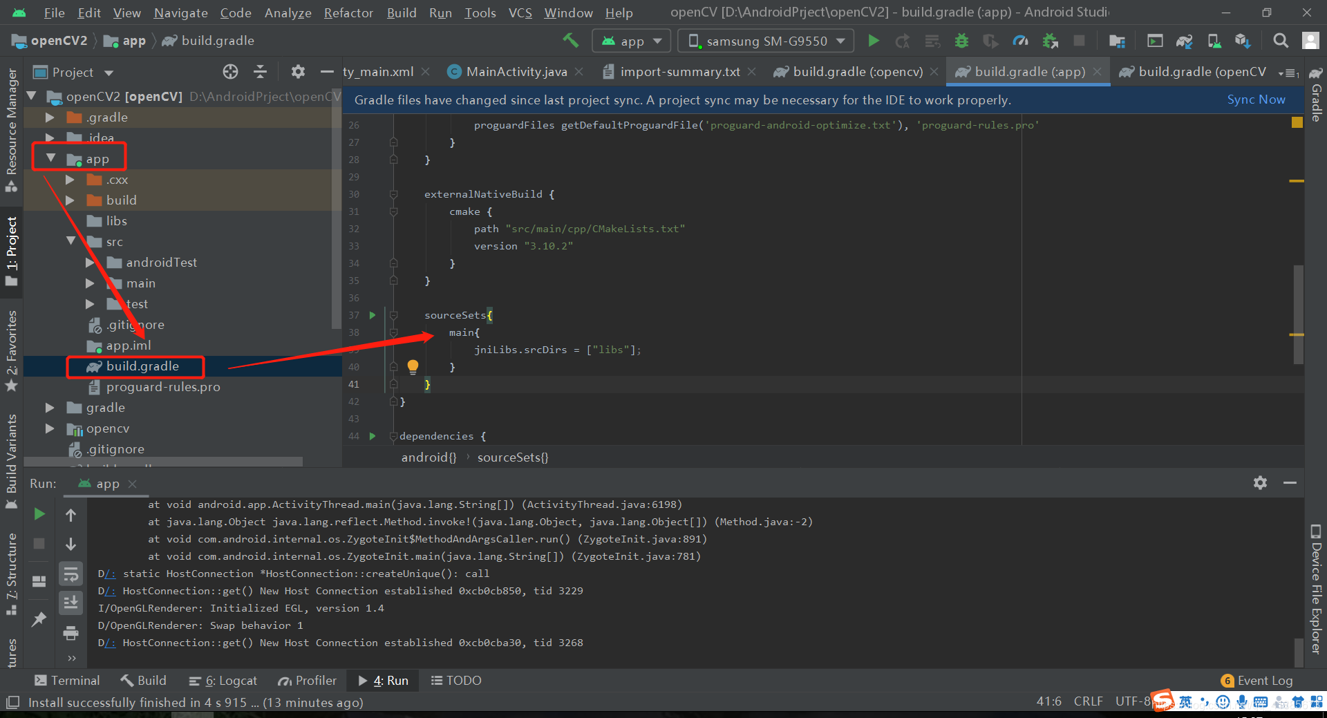 做完这一步,libopencv_java4.so将被自动打包进apk中,但是依旧不能正常运行,提示缺少c++_shared,这需要我们再次修改build.gradle文件,添加arguments: