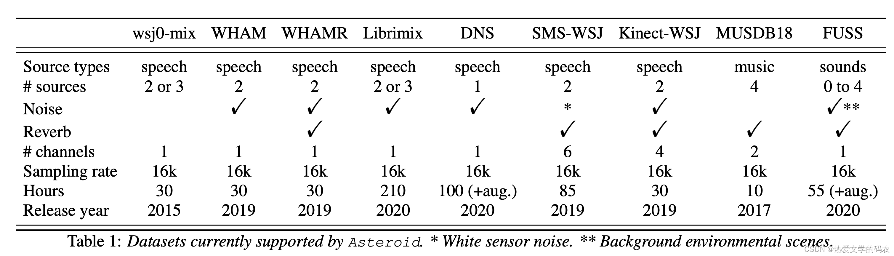 wsj0-2mix和wsj0-3mix、WHAM、WHAMR、LibriMix FUSS、微软深层噪声抑制挑战数据集(DNS)、SMS-WSJ、Kinect- WSJ、MUSDB18。wsj0-2mix和MUSDB18分别是目前用于语音和音乐分离的参考数据集。WHAM、WHAMR、LibriMix、SMS-WSJ和Kinect-WSJ是最近发布的数据集,它们解决了wsj0-2mix的一些缺点。FUSS是第一个处理任意声音分离的开源数据集。注意,wsj0-2mix是WHAM的一个子集,WHAM是WHAMR的一个子集。