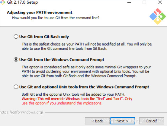 - 这个选项被认为是安全的,因为它只向PATH添加一些最小的 Git包,以避免使用可选的Unix工具混淆环境。 您将能够从 Git Bash 和 Windows 命令提示符中使用 Git。