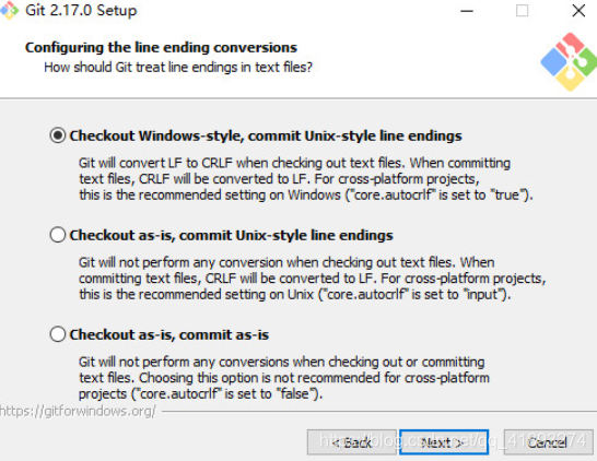 - Git will not perform any conversions when checking out or committing text files.Choosing this option is not recommended for cross-platform projects ("core.autocrlf"is set to "false")