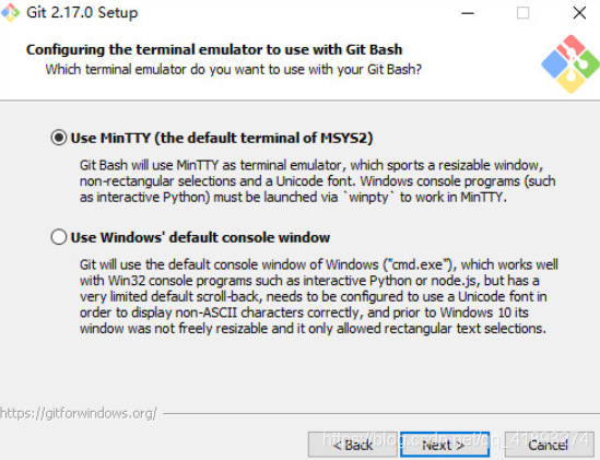 - Git Bash将使用MinTTY作为终端模拟器,该模拟器具有可调整大小的窗口,非矩形选区和Unicode字体。 Windows控制台程序(如交互式Python)必须通过'winpty'启动才能在MinTTY中运行。