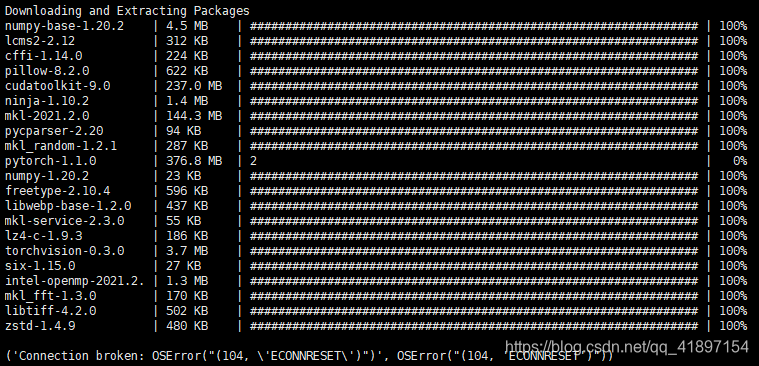 上面这个有点难安装成功,可能是网速的问题也说不准,所以pytorch1.1.0安装会失败,如下