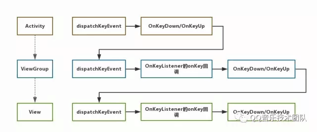 首先走DecorView的dispatchKeyEvent,之后会依次从Activity->ViewGroup->View的方向分发KeyEvent。