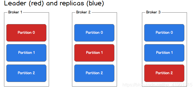 解决单点不可靠的问题,引入了集群。Kafka对集群的支持也是非常友好的。在Kafka中,集群里的每个实例叫做Broker。每个partition不再只有一个,而是有一个leader(红色)和多个replica(蓝色),生产者根据消息的topic和key值,确定了消息要发往哪个partition之后(假设是p1),会找到partition对应的leader(也就是broker2里的p1),然后将消息发给leader,leader负责消息的写入,并与其余的replica进行同步。一旦某一个partition的leader挂掉了,那么只需提拔一个replica出来,让它成为leader就ok了,系统依旧可以正常运行。