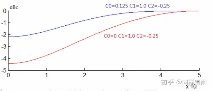 发送端均衡器也就是说FFE的大概效果是什么样子呢?前面说过,频域上讲,FFE相当于一个高通滤波器,调节滤波器的系数可以改变滤波器的频响,以补偿不同的信道特性,一般可以动态配置。以10Gbps线速率为例,图为FFE频率响应演示。可以看到,对于C0=0,C1=1.0,C2=-0.25的配置,5GHz处高频增益比低频区域高出4dB,从而补偿信道对高频频谱的衰减(高频衰减大)。(习惯看示波器的同学,边沿的上升就是对高频的增益加大,去加重和预加重的效果相同,只是信号摆幅一个小一个大)