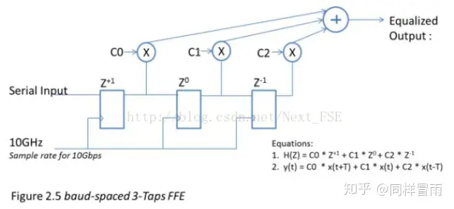 发送侧均衡器设计为一个高通滤波器(HPF), 目标是让到达接收端的信号为一个干净的信号,这就是FFE。FFE的实现方式有很多,一个典型的例子如图: