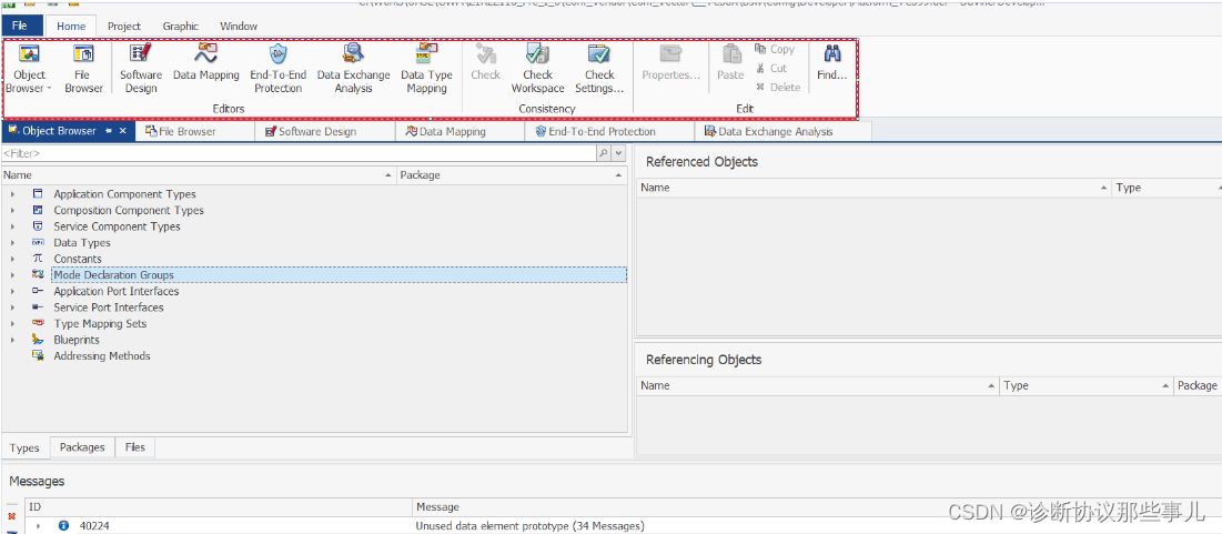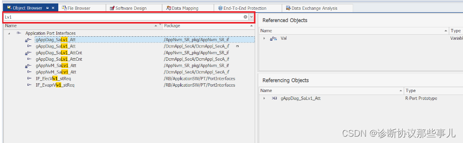 Obiect Broswer主要有上图框出来的两部分,左边是设计ASW,创建IDT,创建S/R Port和C/S Port等区域,右边是显示Port或者IDT在引用关系。 举个例子我们看一个CAN 信号的路由变量: