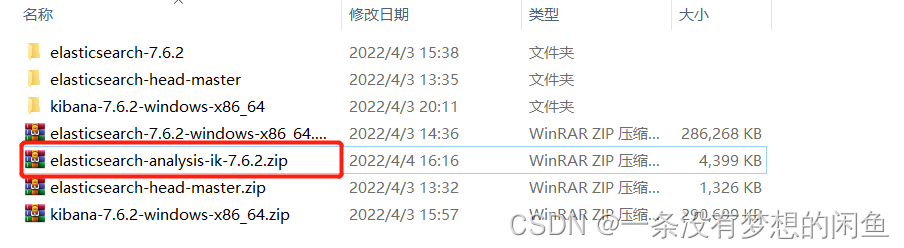 下载地址:https://github.com/medcl/elasticsearch-analysis-ik/releases/tag/v7.6.2