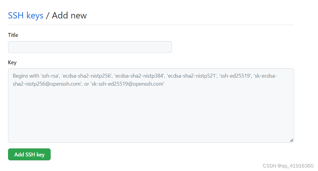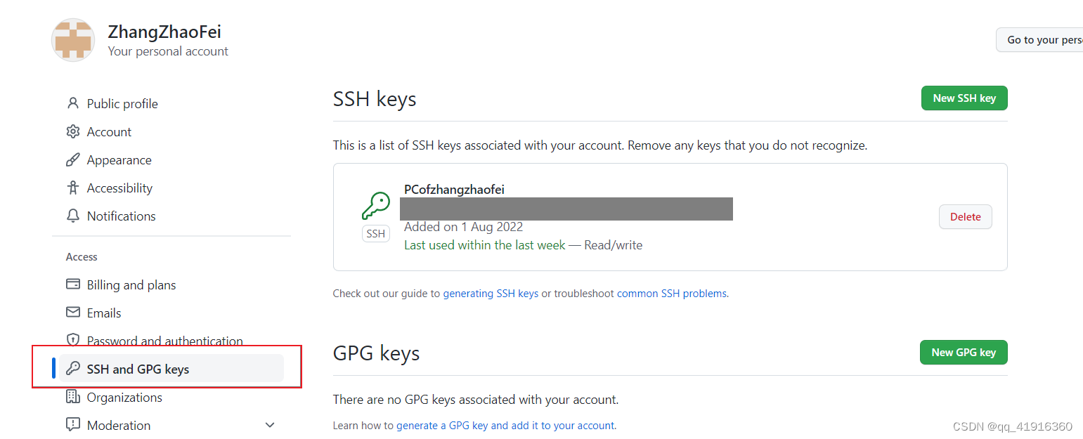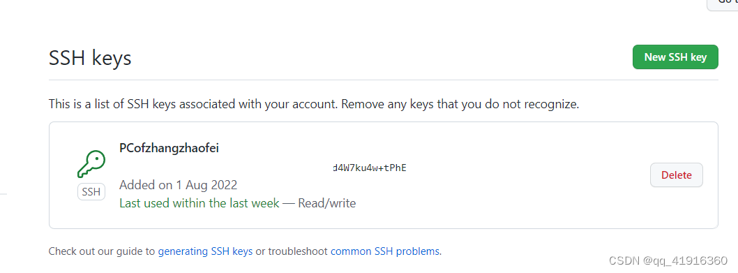 可以看到,我们的key已经在C/用户/.ssh/id_rsa.pub中了,我们将.pub中的Key复制粘贴到前面步骤中的github网页中,这样我们的key就有了。