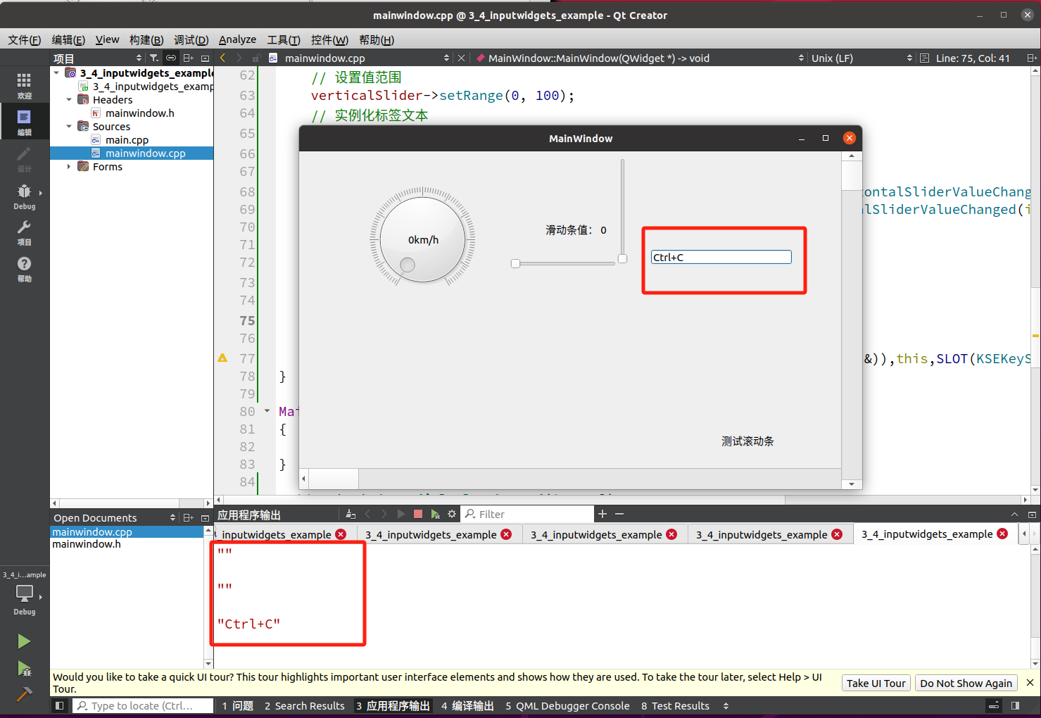 (3)在文件“mainwindow.cpp”修改代码,具体代码如下。 1)设置主窗体的显示位置与大小。—> 2)实例化QKeySequenceEdit对象和显示位置与大小。—>3)信号槽连接。—>4)写出槽函数,捕获键盘输入值。添加完整代码如下。