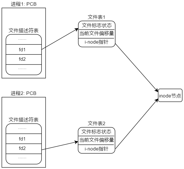 两个不同进程 1 和2 分别是运行在 Linux 系统上两个独立的进程,在他们各自的程序中分别调用 open 函数打开同一个文件,进程 1 对应的文件描述符为 fd1,进程 2 对应的文件描述符为fd2, fd1 指向了进程 1 的文件表 1, fd2 指向了进程 2 的文件表 2;各自的文件表都索引到了同一个 inode 节点,从而实现共享文件。其数据结构关系图如下所示:
