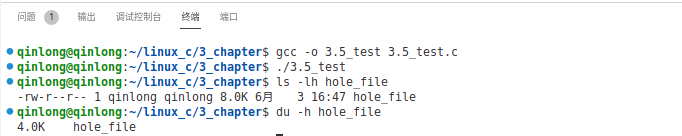 通过这个程序,最终会在文件./hole_file中创建一个4KB大小的空洞,然后向其中写入4KB的数据。由于使用了lseek跳过了文件开始的4KB,所以在文件的开始处会有一个4KB的空洞区域,后面跟着连续的4KB数据。运行并查看文件大小: