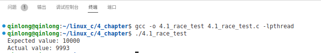 在这个修改后的程序中,每个线程只执行1000次递增操作,同时在每次递增操作前后添加了usleep(10),以模拟一些CPU密集型的操作并增加线程调度的不确定性。由于竞争冒险,shared_counter的实际值很可能小于预期的值(在这个例子中是10000)。通过运行这个程序多次,你应该能够观察到不同的输出值,这些值通常小于预期值,从而演示了竞争冒险的影响。运行的结果如下: