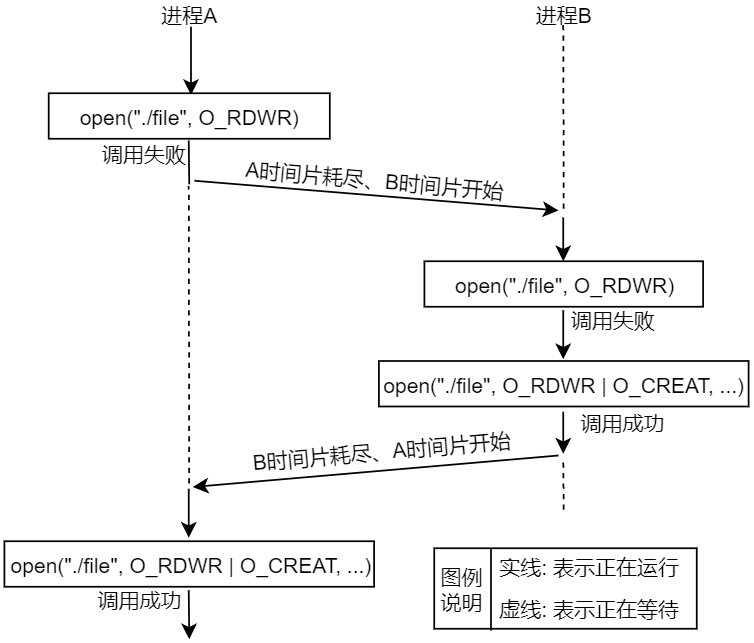 创建文件中存在竞争状态,例如进程 A 和进程 B 都要去打开同一个文件、并且此文件还不存在。进程 A 当前正 在运行状态、进程 B 处于等待状态,进程 A 首先调用 open("./file", O_RDWR)函数尝试去打开文件,结果返 回错误,也就是调用 open 失败;接着进程 A 时间片耗尽、进程 B 运行,同样进程 B 调用 open("./file",O_RDWR)尝试打开文件,结果也失败,接着进程 B 再次调用 open("./file", O_RDWR | O_CREAT, ...)创建此 文件,这一次 open 执行成功,文件创建成功;接着进程 B 时间片耗尽、进程 A 继续运行,进程 A 也调用open("./file", O_RDWR | O_CREAT, ...)创建文件,函数执行成功。