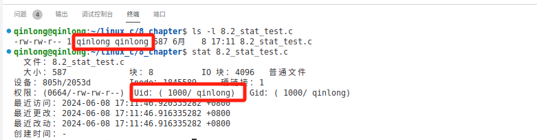 可以使用 ls 命令或 stat 命令便可以查看到文件的所有者和所属组,如下所示: