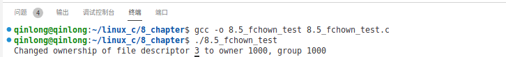 程序首先打开一个名为 "example.txt" 的文件,然后尝试使用 fchown 函数改变该文件的所有权。运行结果如下: