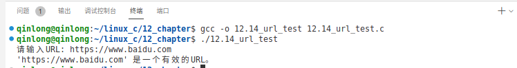 首先程序提示用户输入URL,使用fgets函数读取用户输入后,程序去除末尾的换行符。接着、编译一个预定义的正则表达式,并用它来检查输入的URL。如果URL匹配正则表达式模式,则认为它是有效的,并打印相应消息;否则,打印无效消息。最后,程序释放与正则表达式相关的资源。程序运行结果如下:
