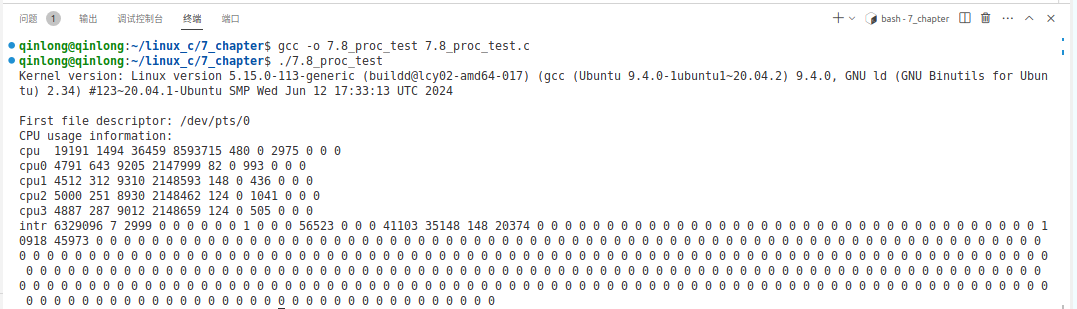 在用户空间程序中使用 read() 系统调用来读取 /proc 文件系统的内容是一种常见的做法,如下程序示例使用 read() 读取内核版本信息、当前进程的文件描述符、CPU 使用情况。