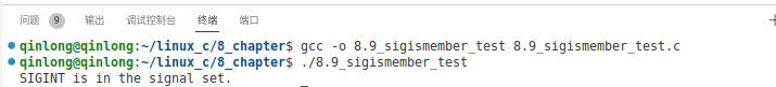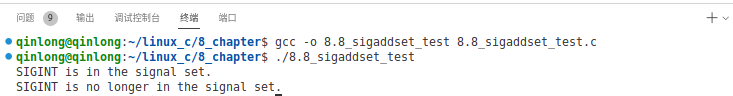 程序首先使用 sigfillset() 填充信号集 set,使其包含所有可能的信号。然后使用 sigismember() 检查 SIGINT是否是信号集的成员,并打印相应的信息。运行结果如下: